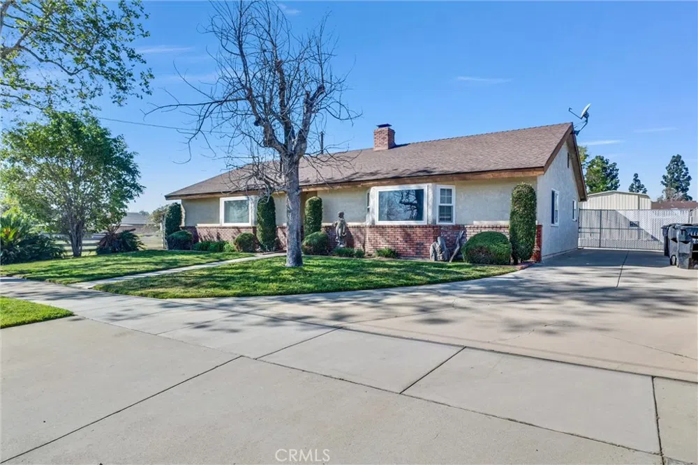 This well cared for single story ranch home boasts an expansive sized lot at 14,500+ sq ft that will fit all your needs! There is an attached 2 car garage along with a secondary extra tall 2 car garage and a fully covered RV storage/shed! The automatic driveway gate provides ease of access to your property while at the same time giving added security. There is also a large lawn space nestled next to matured trees that give plenty of privacy making it a wonderful place to relax or for entertaining! As you enter the foyer you are immediately greeted by a statement piece fireplace that opens to the living room and dining area with vaulted ceilings. There are 3 spacious bedrooms with an easy option for an extra large 4th bedroom if needed and two full bathrooms. There is a secondary living room/entertainment area with a full wet bar and slider doors that enter to the back patio. The entire home flows seamlessly and is ready for someone to add their personal touches to it! The AC and all ducting was newly replaced in approximately 2024 for $25k! Solar is leased, and windows are in newer condition! The roof was additionally partially replaced at the time solar was installed.
