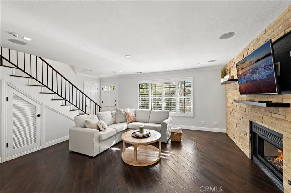 Located in highly desirable East Side Costa Mesa just blocks away from Back Bay this remodeled home features wood floors, plantation shutters, and crown molding throughout. An end unit that feels like a single family home with one shared wall and enclosed front porch provides ultimate privacy. The remodeled kitchen features newer two tone cabinets, Quartz countertops, stainless steel appliances, and farmhouse sink with garden window. The spacious living room showcases a beautiful stone wall fireplace with surround sound open to dining room. Dining room with French doors leads to a private backyard with pavers with plenty of space for entertaining or relaxing. Primary bedroom has a walk-in closet and remodeled en-suite with new cabinets, Quartz countertops, and tiled shower. Spacious secondary bedrooms and hall bathroom boasts dual sinks with shower over tub. Laundry room is conveniently located inside and features built-in cabinets and work station for folding laundry or storage. Living room and patio are wired for sound with speakers. Direct access two car garage with built-in cabinets and a work bench for small or big projects finished with epoxy flooring. This beautiful home awaits you conveniently located near all that Eastside Costa Mesa and Newport Beach shopping, schools, and recreation has to offer.