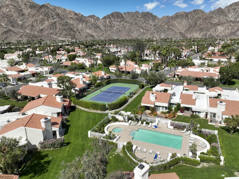 Nestled against the majestic Santa Rosa Mountains in the gated community of Santa Rosa Cove, this charming property sits steps from premier tennis courts. The thoughtful floor plan offers perfect bedroom separation alongside a living and dining area with vaulted ceilings, an elegant gas fireplace, and wet bar. Enjoy mountain-framed sunsets from your private patio or dine al fresco in the intimate front courtyard. The inviting eat-in kitchen provides the ideal setting for entertaining. The light-filled master suite offers direct patio access, creating seamless indoor-outdoor living with mountain views. A dedicated laundry room and two-car garage with ample storage complete this residence. The property features an owned solar system, providing sustainable energy and reduced utility costs year-round. Santa Rosa Cove adjoins the world-renowned La Quinta Resort and Spa, offering owners exclusive access to two public golf courses, swimming facilities, and tennis amenities. Optional golf club membership grants special access to resort dining, tennis, and spa facilities. Experience desert resort living while embracing the natural beauty of the Santa Rosa Mountains and enjoying premier amenities just moments from your doorstep.